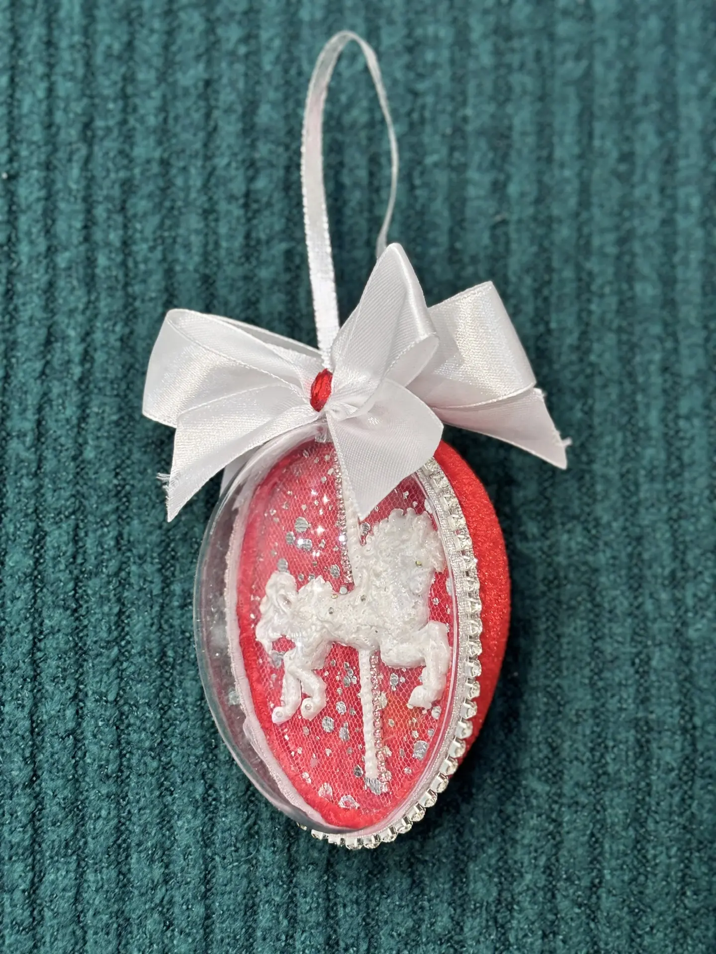 Елочная игрушка "Символ счастья" сделана из фетра, атласной ленты, страз, внутри игрушка символ 2026 года - лошадь из эпоксидной смолы.