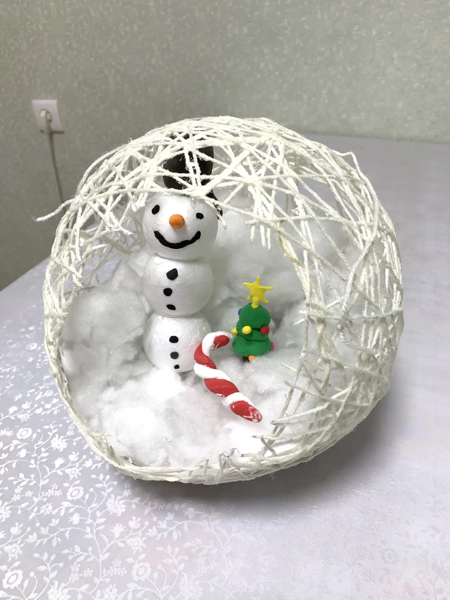 Поделка Снежный шар изготовлен из разного материала: шар из ниток, снеговик из пенопласта, елка и тросточка из воздушного пластилина, снег из ваты и пуха.