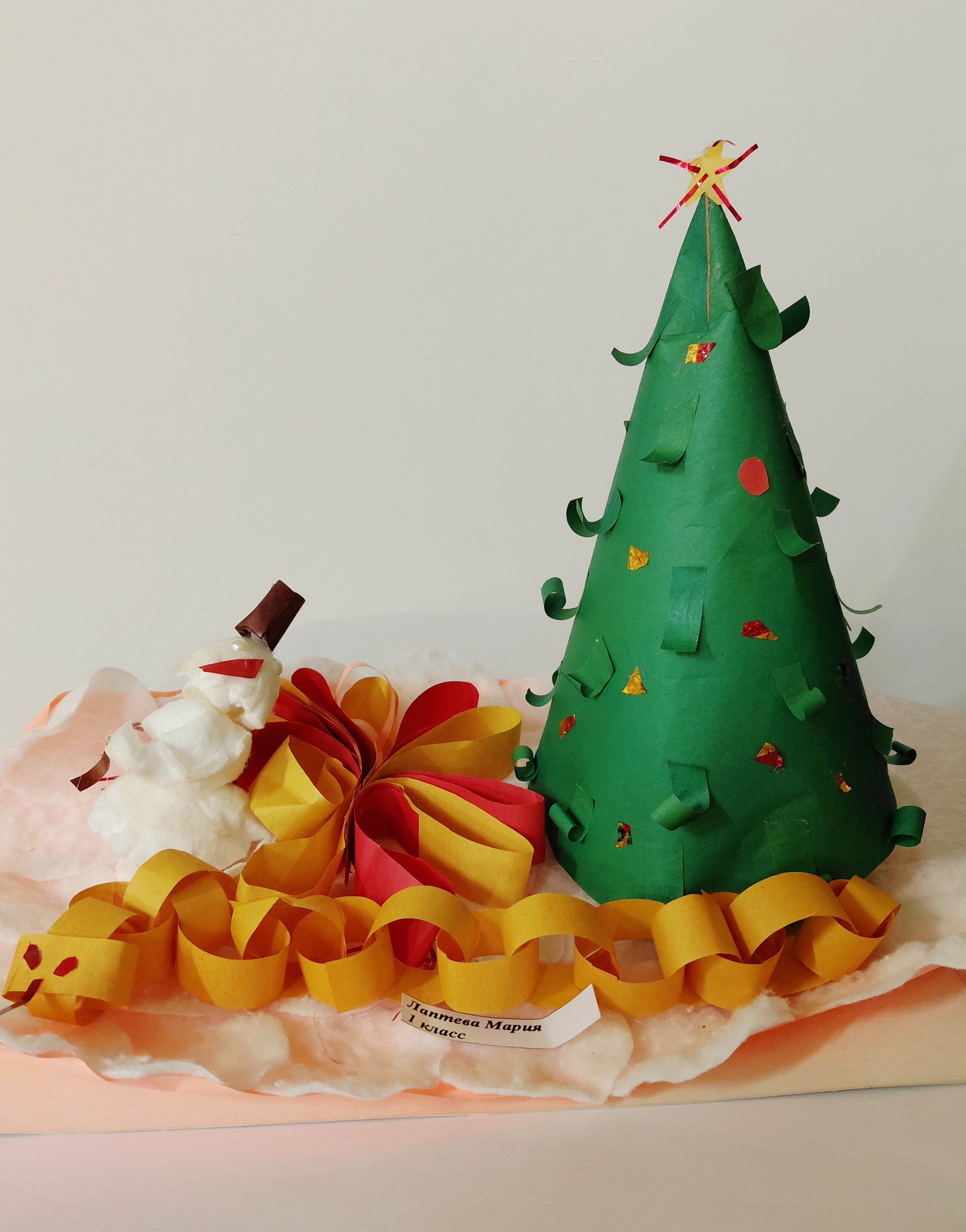 лес из ватных дисков, цветной бумаги, ель из цветной бумаги, разноцветная фольга, клей ПВА