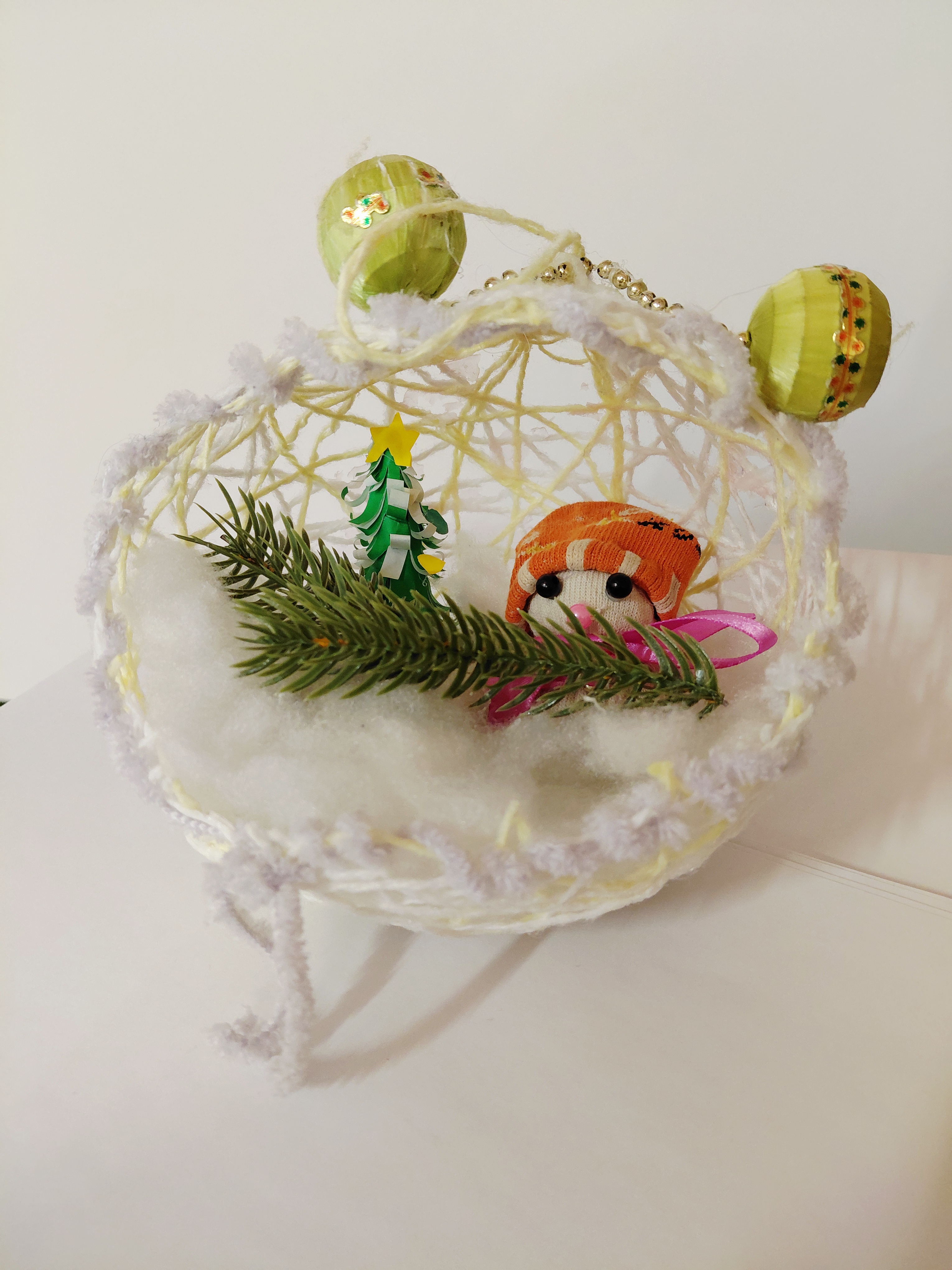 Домик из пряжи, ёлочной цепочки, цветной бумаги, ёлочной ветки, материала, бусы, атласной ленты и горячий клей