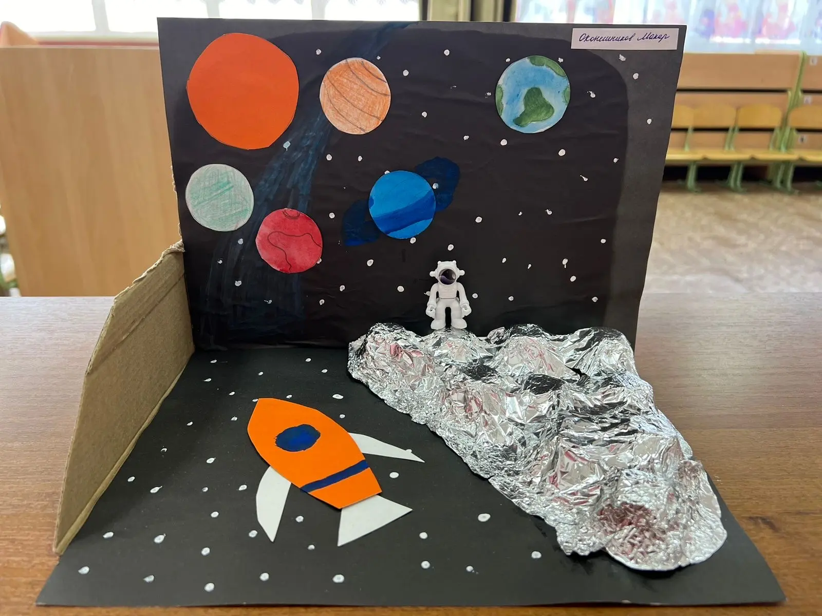 Поделка сделана из ручных материалов, покрасил и выкроил планеты, космонавт сидит на части луны которая сделана из ячейки куриных яиц и обернута фольгой. Макару 5 лет.