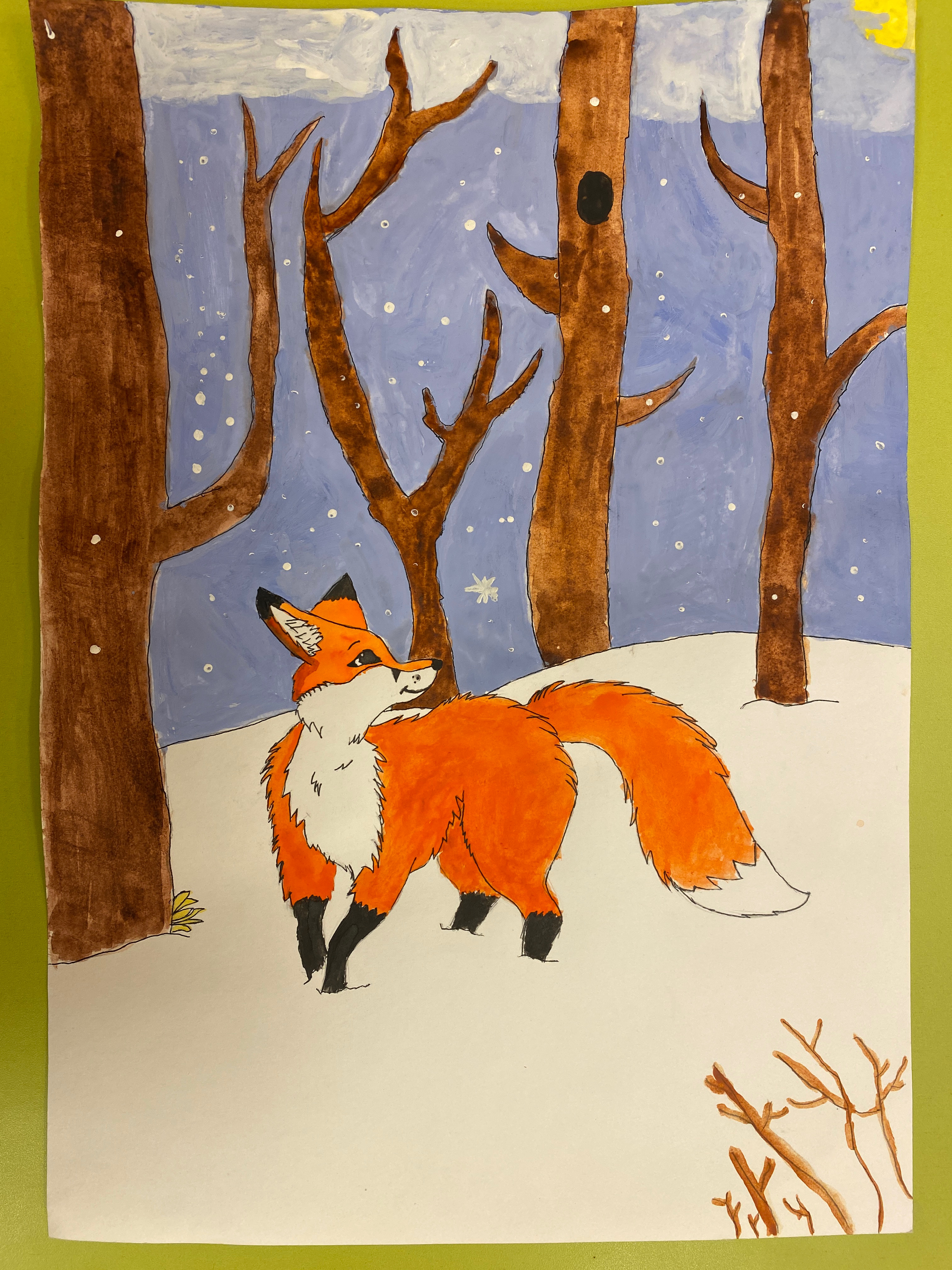 Прокопьева Алина Александровна, 6 лет, дошкольник подготовительной группы изобразила зимний лес и рыжую лисицу